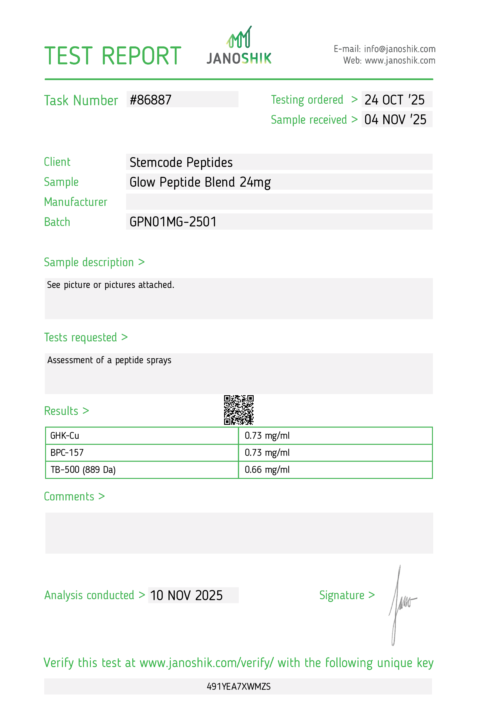 Our Glow Peptides Blend is manufactured with high-purity material and undergoes in-house and independent lab analysis to confirm: